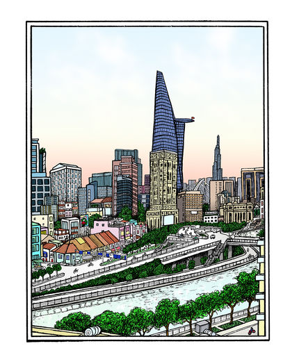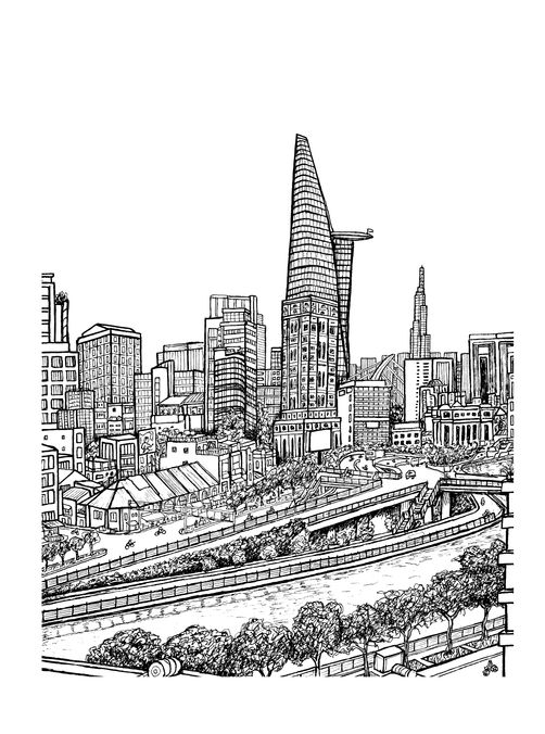 Pen and perncil illustration that explores Ho Chi Minh City's past and present, whilst also looking into the future.