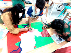 We had the pleasure of teaching a full day of creative workshops to the whole year group of 135 grade 4 students at Saigon South International School. We started the day with an artist talk that detailed my artist career and how I became a full time artist living in Vietnam. Then, we looked at traditional Dong Ho printmaking from north Vietnam and their processes and themes. We also talked about landforms in Vietnam and how these can influence culture.